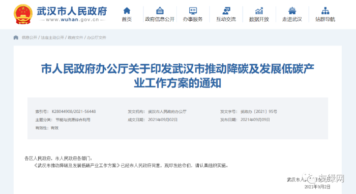 9月9日,武汉市政府官网发布了《武汉市推动降碳及发展低碳产业工作方案》(以下简称《方案》),该《方案》围绕调整优化能源结构、推动重点领域重点行业率先实现“3060”目标、打造全国碳金融中心和营造全社会低碳新风尚等四个方面,制定了18条工作任务。
