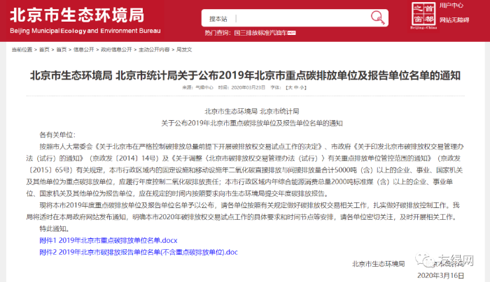 在2019年,《北京市生态环境局 北京市统计局关于公布2019年北京市重点碳排放单位及报告单位名单的通知》中,按照市政府《关于印发北京市碳排放权交易管理办法(试行)的通知》(京政发〔2014〕14号)及《关于调整〈北京市碳排放权交易管理办法(试行)〉有关重点排放单位管控范围的通知》(京政发〔2015〕65号)有关规定,北京市行政区域内的固定设施和移动设施年二氧化碳直接排放与间接排放量合计5000吨(含)以上的企业、事业、国家机关及其他单位为重点碳排放单位,应履行年度控制二氧化碳排放责任。