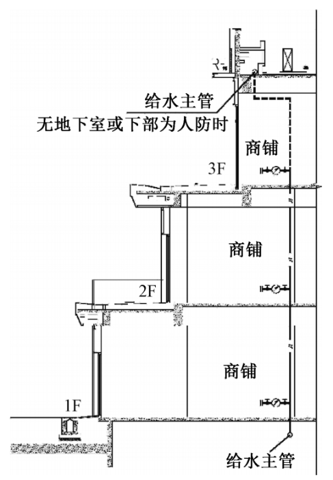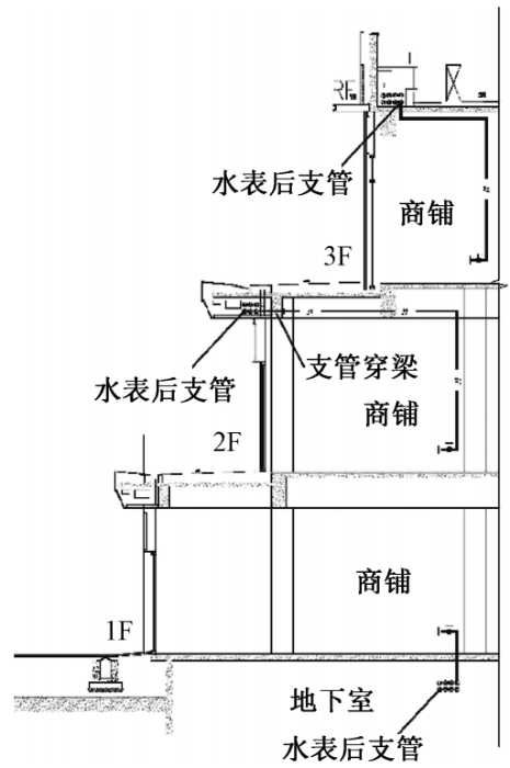 (2)水表集中设置。此种方案应考虑分区域设置集中水表间,以减少水表后支管长度。水表间位置应与建筑协调,设置在便于方便抄表或检修的公区,并在方案阶段充分考虑好给水支管由公区入户的路线,以防施工图设计给水支管“无路可走”的情况发生。本文建议1层商业的给水支管可由地下室或覆土入户。顶层商业可通过设置屋顶机电管廊,支管下穿屋面板入户。若商业街不小于3层且外廊无顶,则需要提资建筑专业,在外廊设置局部管廊用于敷设给水支管。给水管置于室外时需根据当地气候特征采取有效的防冻保温措施。当项目处于严寒或寒冷地区时,室外公区管道保温难度较大,应提示甲方审慎选择此方案。此方案典型设计如图2所示。