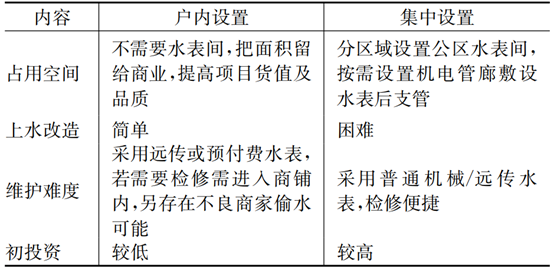 从表1可以看出,若将水表设置户内,除维护不便外,具有初投资低、方便今后分合铺的上水改造、提高商业货值等诸多优点,适用于物业自管的运营模式。