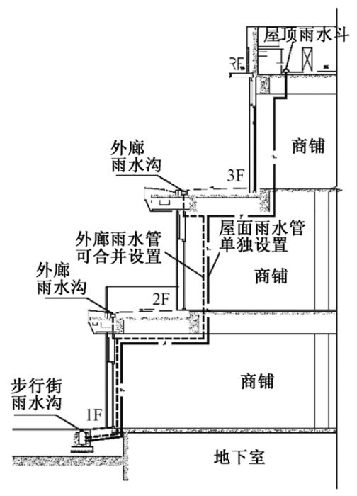 室外商业步行街雨水排水及其复杂,屋顶、各层的外廊、1层内街均需要考虑雨水排水。有相当一部分设计院在设计此类商业时将雨水分段散排至下层屋面,如此设计确实简便,但给今后商业的运营安全带来诸多隐患。