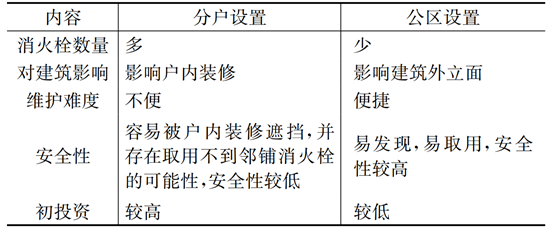 ①分户设置消火栓。分户设置消火栓即在每个商铺里设置一个消火栓,火灾时依靠本铺内和邻铺的消火栓提供两股充实水柱保护。此种布置方式优势在于对建筑外立面无影响,但也存在以下缺点:一方面,消火栓数量多,造价增高;另一方面,火灾时若邻铺未开门,则将导致无法取用邻铺消火栓。
