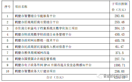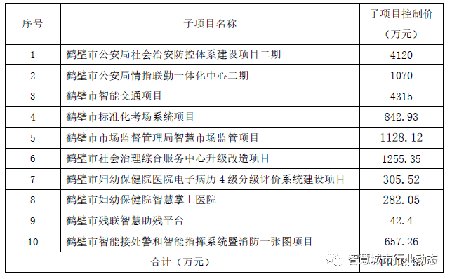 二标段:14018.63万元;鹤壁市新型智慧城市项目将紧紧围绕紧盯建设“高质量富美鹤城”发展目标,以数据资源开发利用为基础,以科技创新为引领,以促进惠民服务、产业创新和政府治理能力提升为重点,以云计算、大数据、智慧城市、人工智能、区块链等新兴信息技术深入集成应用为手段,统筹全市各方力量,汇聚整合各类资源,最终实现综合竞争力显著增强、城市影响力显著增强、文化软实力显著增强、生态承载力显著增强、群众幸福感显著增强的城市发展目标。10个子项目如下: