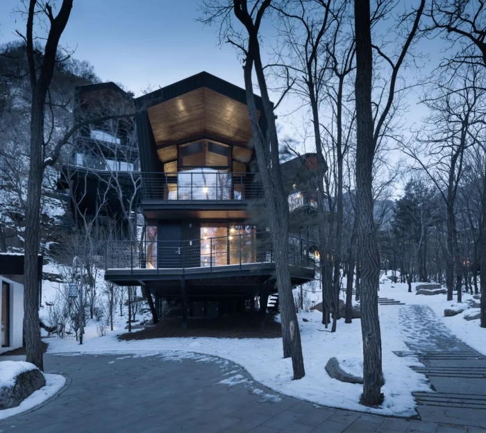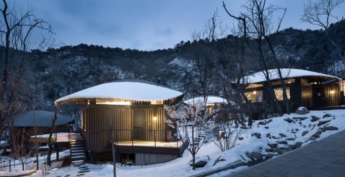 他们选择了隐藏在山谷间散落式布局的手法,减小整体的建筑体量,并将建筑高度确定为不超过树冠,采用深深退后的窗口,规避反射性眩光,使得站在长城上的人不易发现这里,同时也是对「莽撞」小鸟们无形的保护。建筑单元底部以架空的形式布局,为植被留出了足够的生长空间。