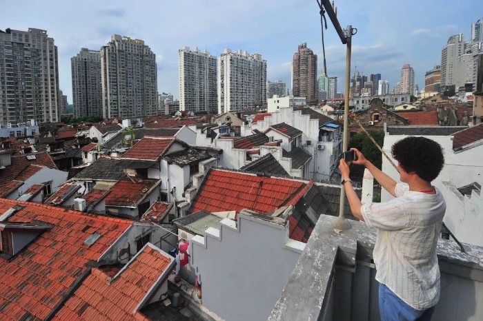 黄浦区新昌路7号地块旧改一位居民在家中5楼的晒台上用手机拍摄这片即将消逝的老房子,留下一个怀旧的念想