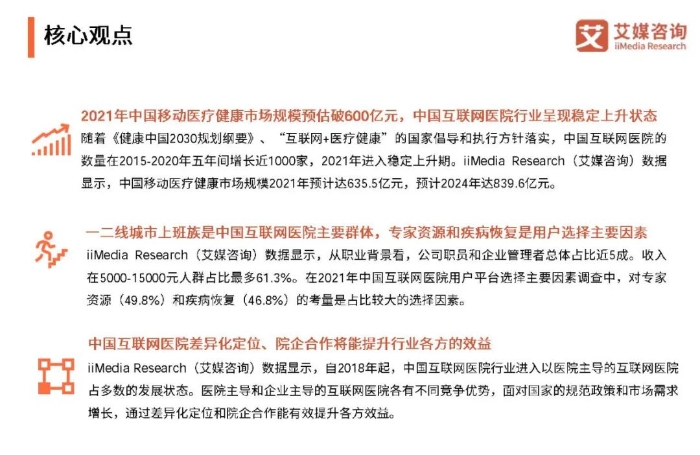 —二线城市上班族是中国互联网医院主要群体,专家资源和疾病恢复是用户选择主要因素。数据显示,从职业背景看,公司职员和企业管理者总体占比近成。收入在5000-15000元人群占比最多61.3%。在2021年中国互联网医院用户平台选择主要因素调查中,对专家资源(49.8% )和疾病恢复(46.8% )的考量是占比较大的选择因素。