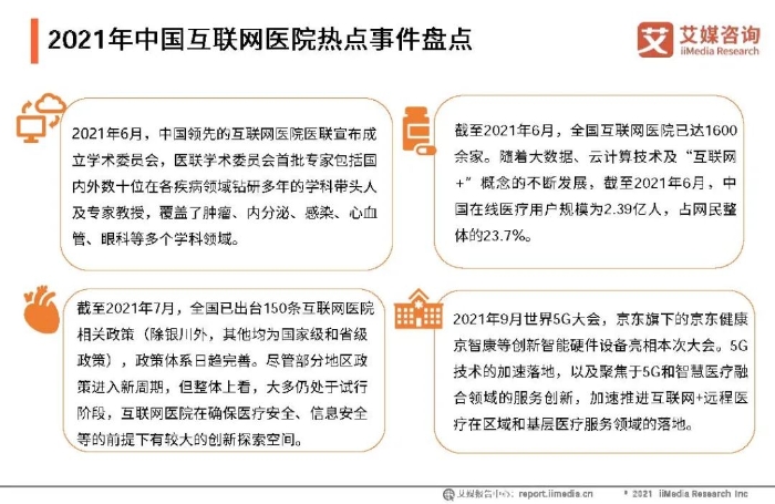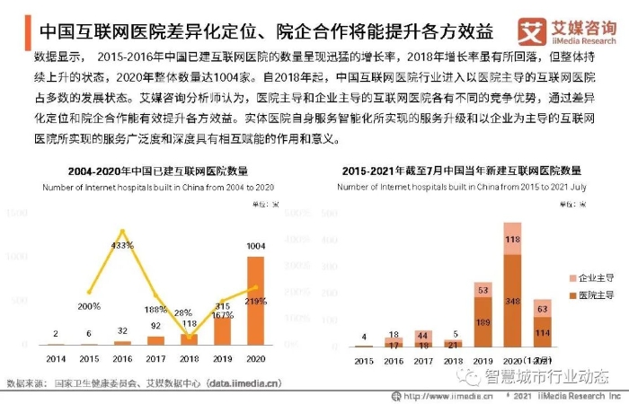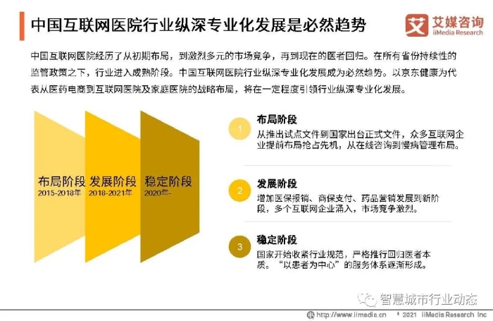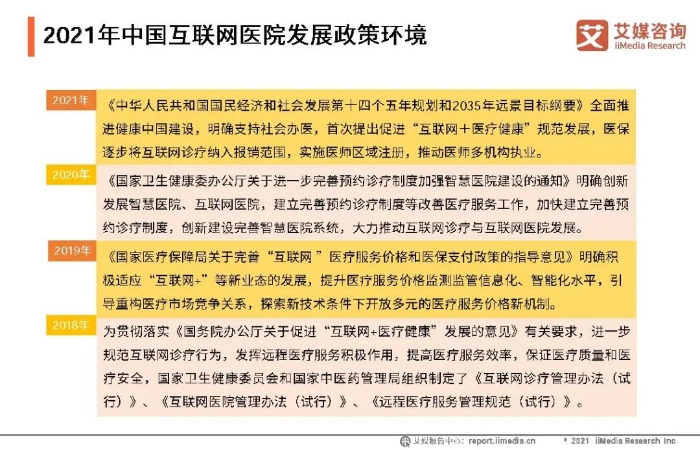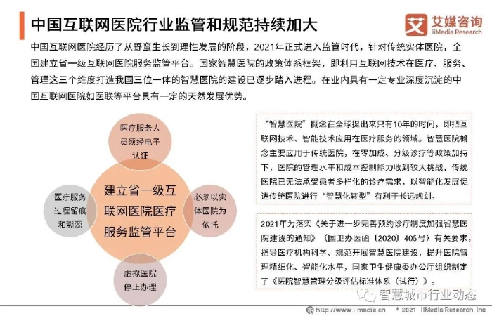 ①中国互联网医院经历了从野蛮生长到理性发展的阶段,2021年正式进入监管时代,针对传统实体医院,全国建立省一级互联网医院服务监管平台。