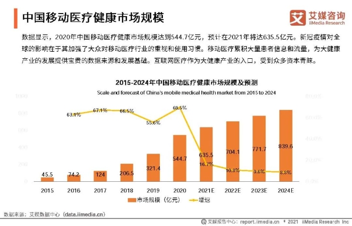 2021年中国移动医疗健康市场规模预估破600亿元,中国互联网医院行业呈现稳定上升状态。随着《健康中国2030规划纲要》、“互联网+医疗健康”的国家倡导和执行方针落实,中国互联网医院的数量在2015-2020年五年间增长近1000家,2021年进入稳定上升期。数据显示,中国移动医疗健康市场规模2021年预计达635.5亿元,预计2024年达839.6亿元。