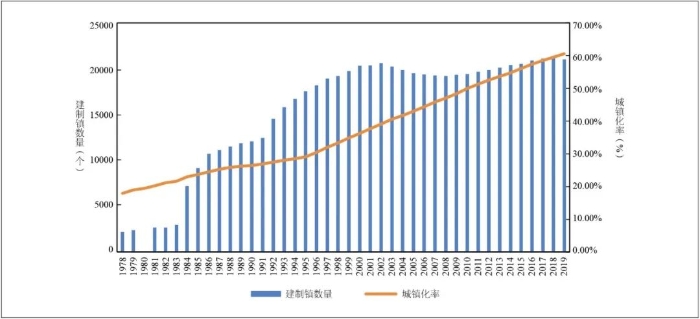 图1 2000—2019年我国建制镇数量与城镇化率变化图