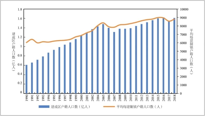 图2 1990—2018年我国建制镇建成区户籍人口与平均人口规模变化图