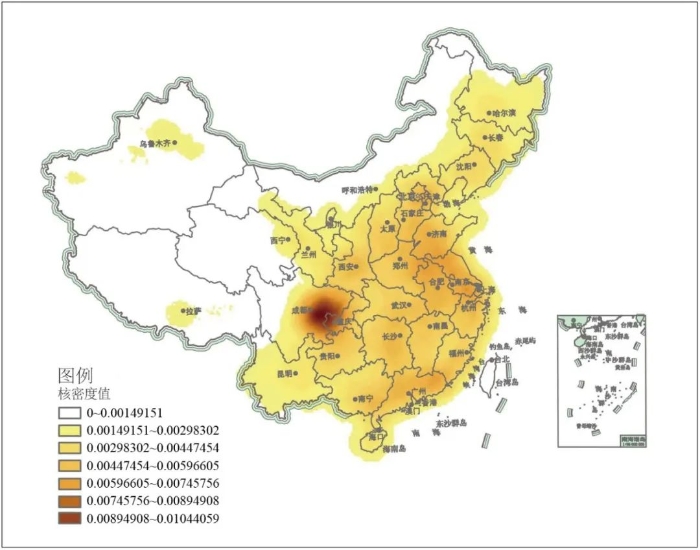 第三,小城镇空间分布差异大。小城镇分布整体呈现“西北疏、东南密”的分布格局,其中高度密集分布于四川盆地(成都平原)、华北平原、长江中下游平原和珠三角地区(见图3)。