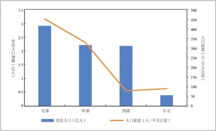 图5 2017年我国分区域小城镇的人口规模与人口密度差异对比图