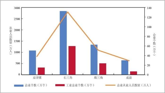 第五,存在区域差异,仍具有一定发展不均衡特征。结合《中国县域统计年鉴(乡镇卷)》的相关数据来看,2017年,东部地区建制镇的常住人口密度约为451人/平方公里,中部地区建制镇的常住人口密度约为329人/平方公里。而地域广袤的西部地区,建制镇常住人口密度仅为79人/平方公里,甚至还略低于东北地区(见图5)。从城市群尺度看,形成了以京津冀、长三角、珠三角、成渝地区为主的四大增长极。2017年,四个城市群内建制镇的常住人口规模总和便超过了2亿人。此外,长三角、珠三角地区的小城镇不论在企业个数、工业企业个数、企业从业人员数量等方面均表现出较突出的发展优势(见图6)。