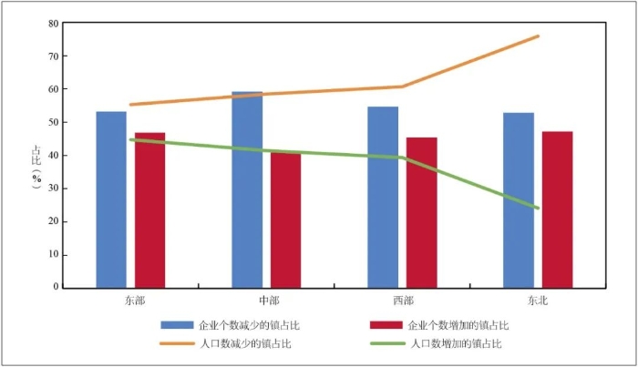 第七,区域演变趋势具有差异。对东部地区而言,人口增长型小城镇的增长幅度大于人口收缩型小城镇的减少幅度,所以总体上小城镇人口表现为增长。而中、西、东北部地区则呈现出相反的趋势,且以东北地区的人口流失最为突出。企业数量方面,我国小城镇总体呈现了企业减少趋势。这可能是发展滞后地区企业流失,以及发达地区企业规模化发展、淘汰落后企业所产生的综合作用结果(见图9)。