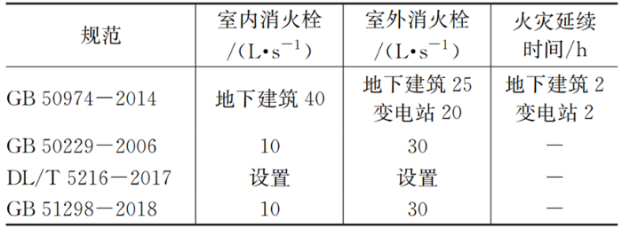 (3)《35~220 kV城市地下变电站设计规程》(DL/T 5216-2017)中要求本工程需设置室内外消火栓系统,并对室内消火栓安装位置有相关要求,但对室内外消防用水量未做详细要求,具体设计标准依据火灾危险性、火灾特性和环境条件等因素综合确定。