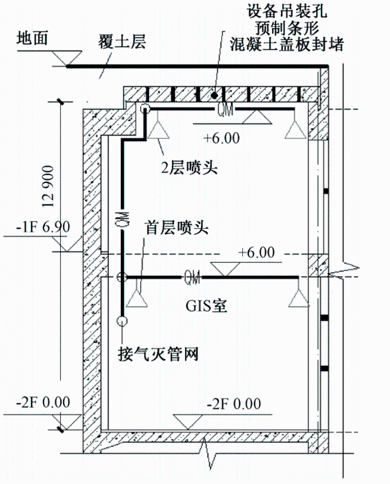 GIS室、1号主变间、2号主变间净空高度为12.9 m,考虑气体灭火的喷头保护高度不宜大于6.5 m,因此对此高大空间气灭保护区采用双层气灭喷头保护,GIS室及主变间气灭保护区上方吊装孔,采用预制条形混凝土盖板进行封堵,封堵需严密,封堵物承压需大于1 200 Pa,如图2所示。
