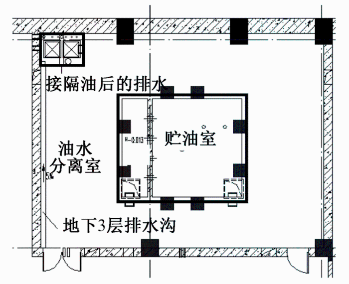 消防电梯排水、消防泵房排水单独考虑,其中消防电梯排水需求按《消防给水及消火栓系统技术规范》要求考虑,按有效容积>2 m³,总水泵流量>10 L/s;消防泵房排水泵总排水能力按不小于补水管的补水能力选型,避免水池液位判断失误时持续补水影响变电所运行。变电所局部低点排水,按《地铁设计防火规范》(GB 51298-2018)要求总排水能力不应小于一次消防的室内消防水量及结构渗漏水量总和,其中室内消防水量144 m³/h,结构渗漏水量不超过0.5 m³/h。考虑单设一处排水泵站体量较大,因此在本工程地下3层设置5处小体量排水泵站,单处排水能力30 m³/h,满足排水需求。变电所内地下1层、地下2层消防排水通过地漏及楼面层找坡排至地下3层,地下3层由排水沟组织将排水排至各处小集水坑。其中主变间排水,需经过地下隔油室后,再排至集水坑,如图3所示。所有排水泵均按一级负荷消防电源配电,参与消防期间排水,本工程建筑设备自动化系统(BAS)监控水泵状态。