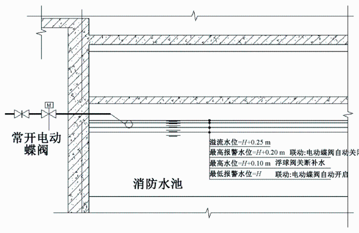 (3)消防水池补水需要具备远程BAS自动控制功能。因本工程属于无人值守工程,消防水池补水浮球阀为易损件,如发生故障,运营人员从收到高报警液位信号至关断阀门期间易引起供水大量流失,且更换阀门期间供水不能自动控制。基于上述考虑,在本工程消防水池设置超声波液位计,补水管设置电动蝶阀,在浮球阀故障后通过超声波液位信息反馈至BAS联动控制补水管上电动蝶阀的开启及关闭,如图4所示。