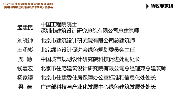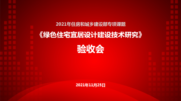 2021年11月25日,“2021年住房和城乡建设部专项课题《绿色住宅宜居设计建设技术研究》验收会”在北京举行。以中国工程院院士、深圳市建筑设计研究总院有限公司总建筑师孟建民为顾问,北京市建筑设计研究院有限公司总建筑师刘晓钟为组长的验收专家组对课题进行认真审查和质询,对课题组高质高效超计划的成果给予高度评价,一致通过验收。部标准定额司、协会领导及课题参加单位线上线下约50人参加了会议。