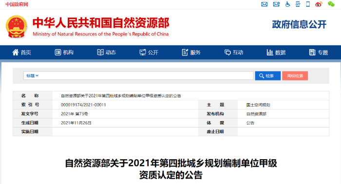 自然资源部关于2021年第四批城乡规划编制单位甲级资质认定的公告