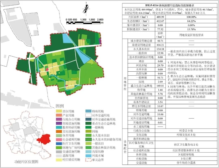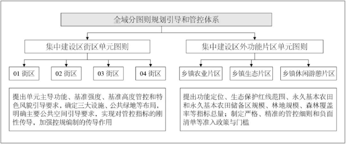 三是划定城乡统筹的管控图则,构建“集中建设区街区单元+集中建设区外功能片区单元”的规划引导和管控体系,形成全域分图则规划引导(见图4)。针对集中建设区街区单元,重点提出单元主导功能、基准强度、基准高度管控和特色风貌引导要求,实现对管控指标的刚性传导,加强对控规编制的指导;针对乡村地区,以村庄行政边界为基础,确定功能片区单元,共划定农业片区、生态片区和休闲游憩片区3类16个功能片区,编制功能片区单元图则,实现镇域全覆盖的网格化、信息化、精细化管理,为村庄的建设管理提供依据(见图5)。
