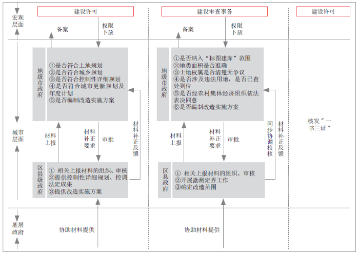 鉴于历史用地手续完善涉及土地规划、城乡规划、土地调查监测、土地征收、土地确权登记和土地执法等系列事项,需各级政府、多部门协调共同完成,在省级政府委托授权之后,广州从优化现行土地审批框架、建立市区协同机制着手,基于市、区两级管理事权对用地审批流程进行优化。具体来说,以各区级政府作为完善历史用地手续的第一责任主体,要求区级政府对报批材料进行审核、上报,并对报批材料的真实性负责。而市级政府负责历史用地的实质性审查,重点对审查报件的合法合规性负责。同时,为避免历史用地情况复杂、协调内容多、审查部门难以准确和快速做出判断等问题,广州结合“规划—审批—许可”流程,在省级政府下发的审查要点基础上,从“两头看”的规划事务和建设审查事务两个角度统一审查内容与标准,市、区两级主管部门在上报过程可对具体事项进行多轮沟通,通过“市区联审”机制提高审批效率( 图3)。