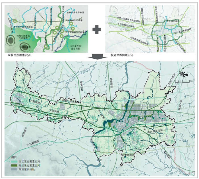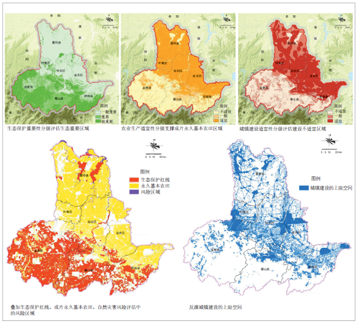 “双评价”围绕生态保护重要性、农业开发适宜性和建设开发适宜性三方面展开评价。生态保护重要性评价基于生物多样性维护、水源涵养、水土保持和水土流失评价结果,取生态重要性与生态敏感性最高的区域作为生态保护极重要区。六安的生态保护极重要区共有4221km²,主要集中在南部大别山区,是生态保护红线和自然保护地划定的重点区域,城镇开发边界划定需要避让。农业开发适宜性评价基于水土资源基础、气候评价结果,通过土壤环境容量、地块集中连片度和离心距离等因素进行修正。根据评价结果,六安市的农业开发适宜区有7922km²,主要集中在北部平原区,作为永久基本农田划定的主要区域。建设开发适宜性评价基于土地资源和水资源评价结果,通过区位优势度、地块集中连片度和文化保护重要性等因素进行修正。根据评价结果,六安市的城镇建设不适宜区有5330km²,主要集中在大别山区。在“双评价”基础上叠加生态保护极重要区、城镇建设不适宜区、生态保护红线、成片永久基本农田及自然灾害风险评估中的风险区域,共有10778km²,扣除过于细碎的图斑反演出城镇建设的上限空间为4675km²,占市域面积的30%,避免城镇开发建设活动侵占资源环境的本底空间( 图3)。
