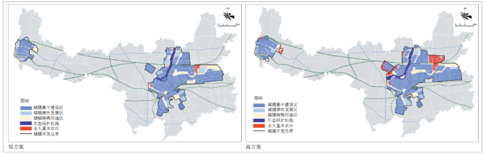 图7 中心城区城镇开发边界划定高低方案及“三线”协调分析图
