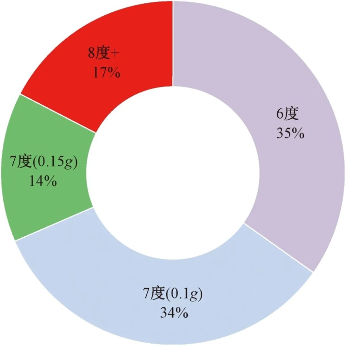 中国地处环太平洋火山地震带和欧亚地震带之间,是世界上地震灾害最严重的国家之一。中国的地震活动主要分布在五个地区的23条地震带上。其中,将7度(0.15g)及其以上地区称为高烈度地震区,我国主要城市在高烈度地震区的分布比例约为31%(图1)。可见,中国城市化发展面临严峻的抗震设防工作。