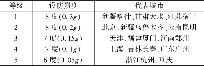 不同抗震设防烈度的代表城市见表1。从表1可以看出,中国高烈度地震区主要位于西南地区、西北地区和中部地区。位于1~3等级地区及场地条件差的7度区的项目(比如上海地区,场地特征周期Tg=0.9s)对抗震技术有高标准的要求。