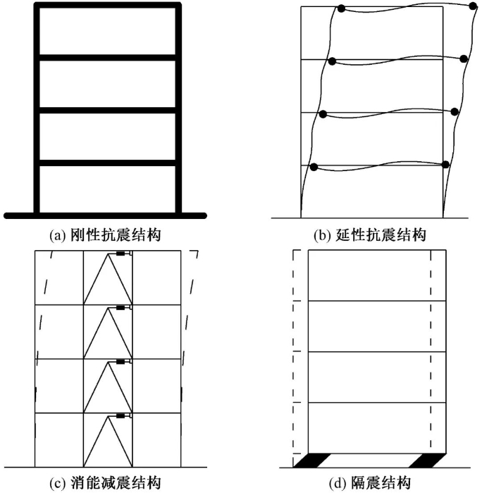 我国抗震结构主要包括刚性抗震结构、延性抗震结构、消能减震结构及隔震结构四种结构形式[1],如图2所示。