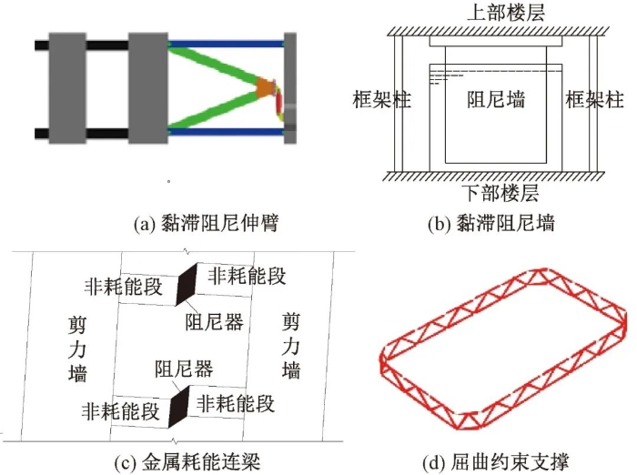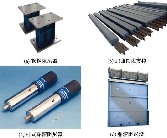 常用的减震装置有金属阻尼器和黏滞阻尼器[2],如图3所示。其中,金属阻尼器属于位移相关型阻尼器,在地震往复作用下通过金属材料屈服时产生的弹塑性滞回变形耗散地震能量,如软钢阻尼器和屈曲约束支撑;黏滞阻尼器属于速度相关型阻尼器,在地震往复作用下利用其黏滞材料的阻尼特性来耗散地震能量,如杆式黏滞阻尼器和黏滞阻尼墙。