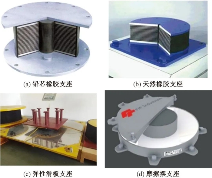 常用的隔震装置有叠层橡胶支座(图4(a),(b))和滑动支座(图4(c),(d)),两者均具有较大的竖向刚度,以便承受巨大的上部结构重量,水平刚度则相对小很多,以隔离输入结构的地震能量。
