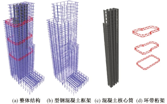 昆明滇池会展中心S2采用型钢混凝土框架+混凝土核心筒+环带桁架的结构体系。环带桁架布置在22,33,42层,如图14所示。