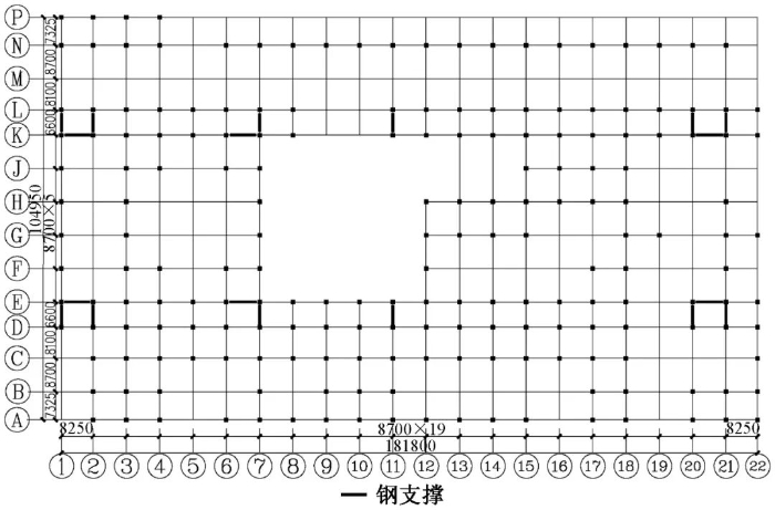 基于博物馆建筑的特点,初步阶段提出采用“型钢混凝土柱+钢梁+钢支撑”的刚性结构体系,满足灵活的建筑布置,典型结构平面布置如图18所示。