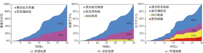 项目中消能装置数量及发挥耗能情况如表2所示。其中,黏滞阻尼伸臂和黏滞阻尼墙在小、中、大震作用下均发生耗能作用;金属耗能连梁和屈曲约束支撑在小震作用下仅提供刚度,在中、大震作用下进入屈服耗能,保证结构在中、大震作用下的抗震性能;随着地震烈度的增加,钢连梁和屈曲约束支撑陆续参与耗能(图16),结构附加阻尼比随之增大,有效地保证了结构的抗震性能。