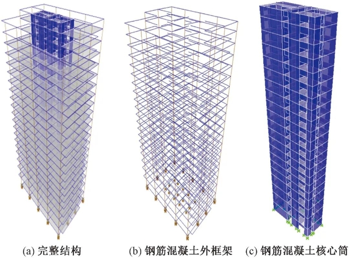 喀什农商银行总部大楼[14]一期建筑高度为86m,地下1层,地上19层,总建筑面积为3.5万m2,裙房与主塔楼设缝脱开,其建筑外观如图21所示。项目主塔楼采用钢筋混凝土框架-核心筒结构体系,如图22所示。