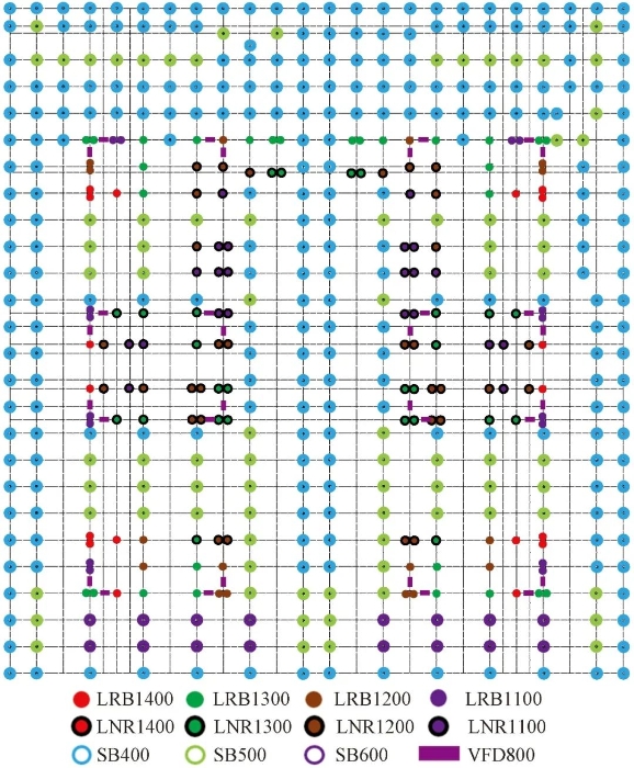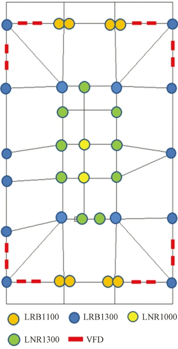 隔震层共布置铅芯橡胶支座(LRB)74个、天然橡胶支座(LNR)96个、滑板支座(SB)356个、黏滞阻尼器(VFD)32个,具体布置如图29所示。