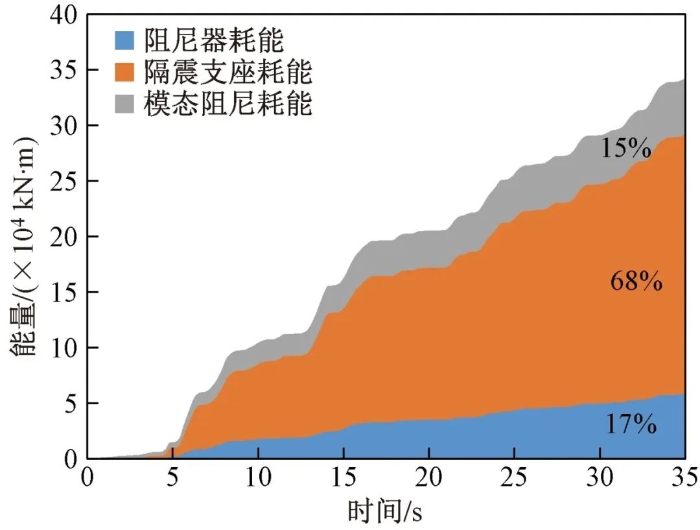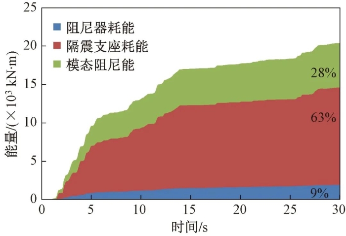 隔震层各部分在罕遇地震下能量耗散情况如图30所示,罕遇地震作用下能量时程分析结果表明,输入给隔震结构的地震能量大部分由隔震支座和阻尼器耗散,其中隔震支座耗能占比68%,阻尼器耗能占比17%,隔震层总耗能占结构整体耗能的85%,大大减小了输入到上部结构的地震能量。