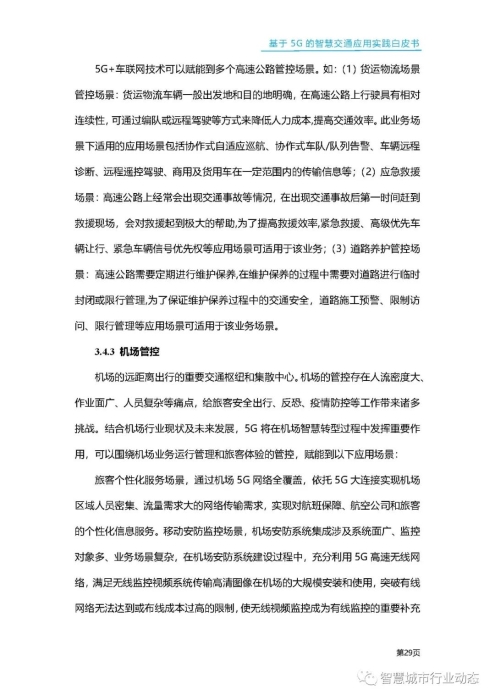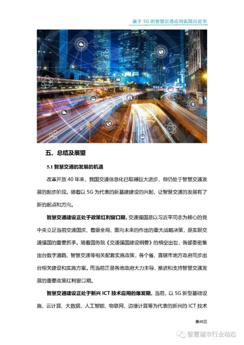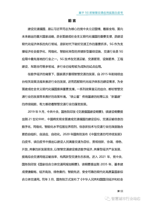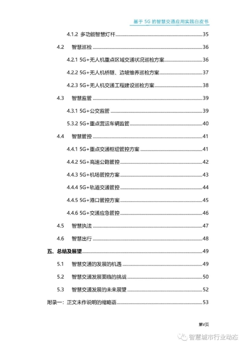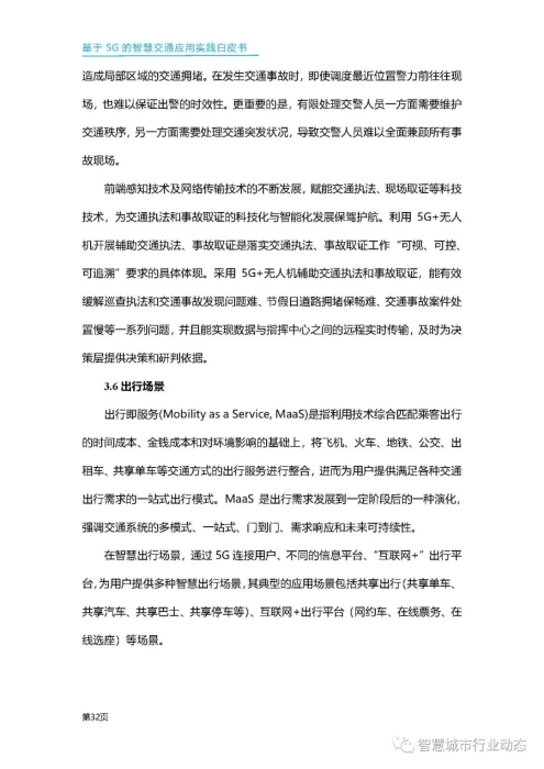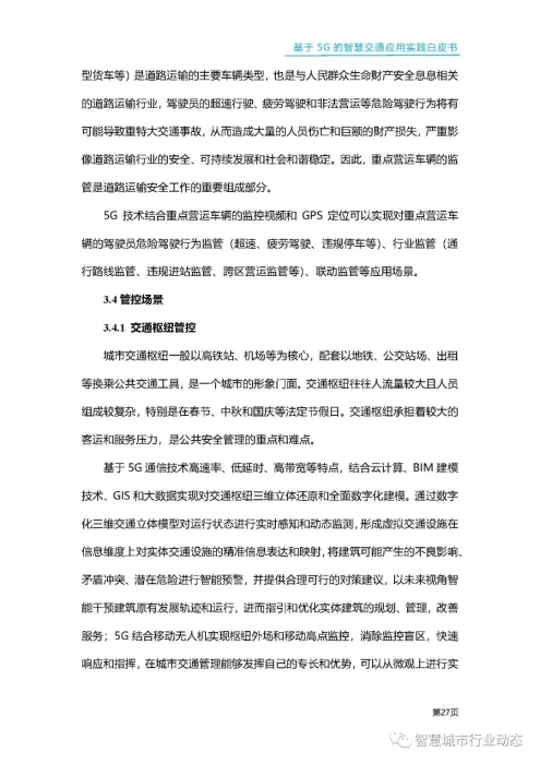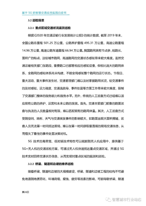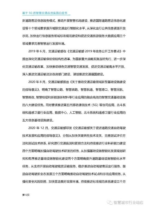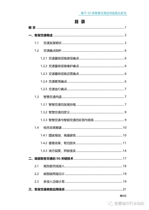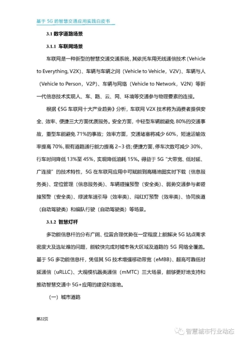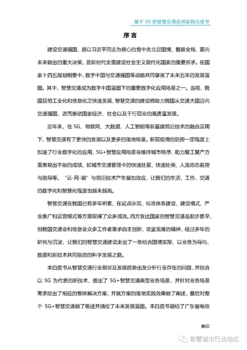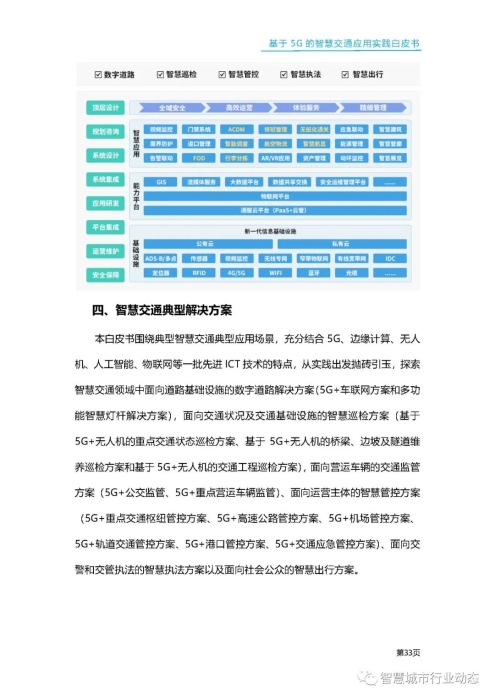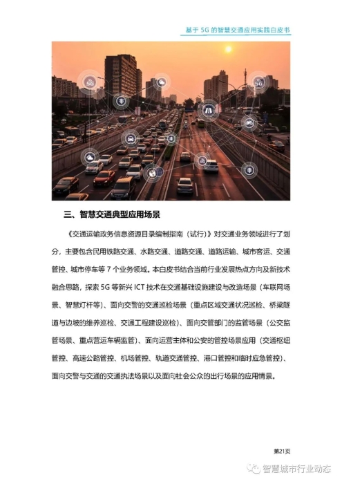 本白皮书围绕典型智慧交通典型应用场景, 充分结合 5G 、边缘计算、无人机、人工智能、物联网等一批先进 I CT 技术的特点, 从实践出发抛砖引玉,探索智慧交通 领域 中 面向道路基础设施的数字道路解决方案( 5G+ 车联网方案和多功能智慧灯杆解决方案),面向交通状况及交通基础设施的智慧巡检方案(基于5G+ 无人机的重点交通状态巡检方案、基于 5G+ 无人机的桥梁、边坡及隧道维养巡检方案和基于 5G+ 无人机的交通工程巡检方案), 面向营运车辆的交通监管方案( 5G+ 公交监管、 5G+ 重点 营运车辆监管 、面向 运营主体 的智慧管控方案5G+ 重点交通枢纽管控方案、 5G+ 高速公路管控方案、 5 G+ 机场管控方案、5G+ 轨道交通管控方案、 5G+ 港口管控方案、 5G+ 交通应急管控方案)、面向交警和交管执法的智慧执法方案以及面向社会公众的智慧出行方案。