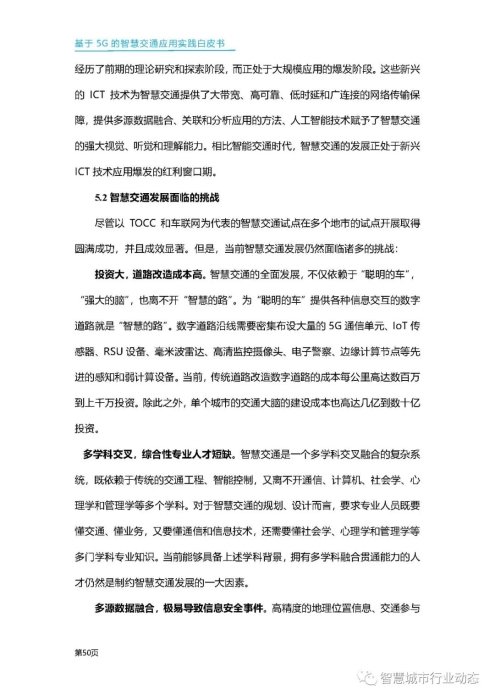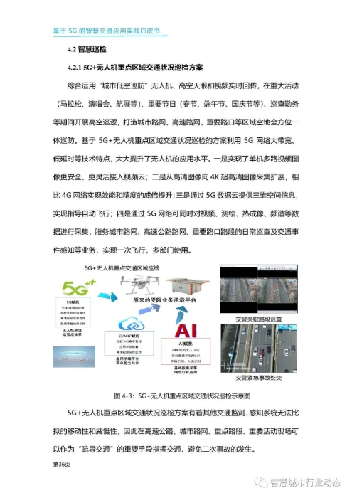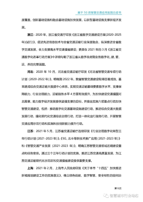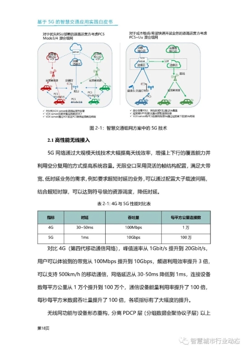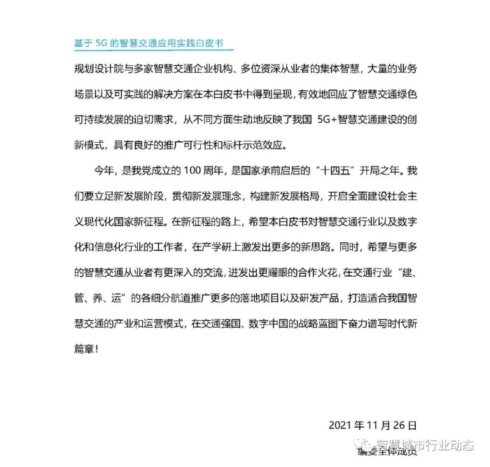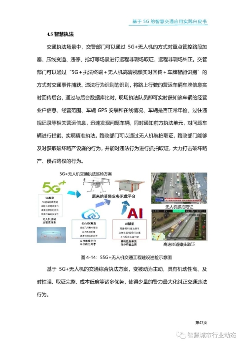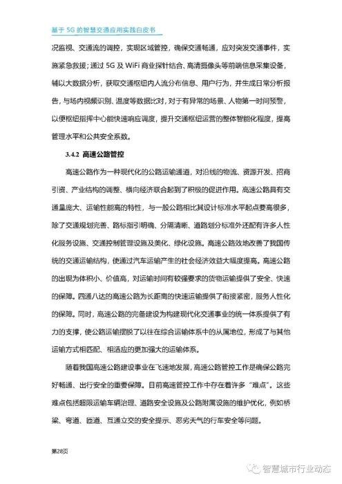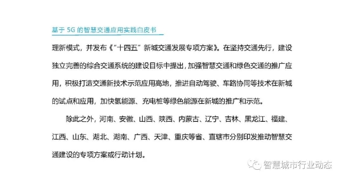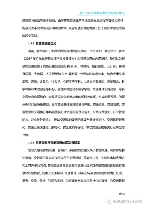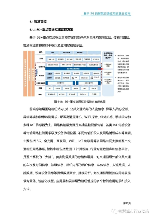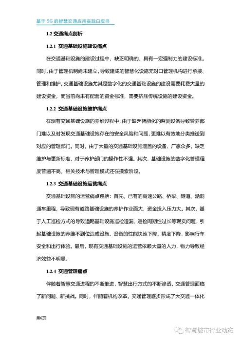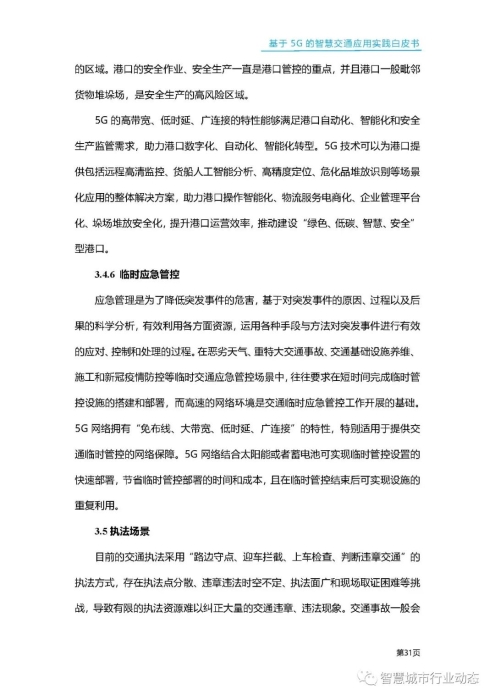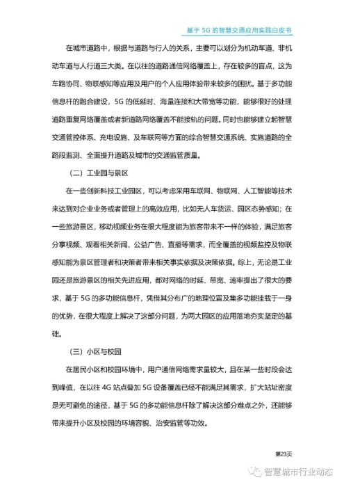 本白皮书围绕典型智慧交通典型应用场景, 充分结合 5G 、边缘计算、无人机、人工智能、物联网等一批先进 I CT 技术的特点, 从实践出发抛砖引玉,探索智慧交通 领域 中 面向道路基础设施的数字道路解决方案( 5G+ 车联网方案和多功能智慧灯杆解决方案),面向交通状况及交通基础设施的智慧巡检方案(基于5G+ 无人机的重点交通状态巡检方案、基于 5G+ 无人机的桥梁、边坡及隧道维养巡检方案和基于 5G+ 无人机的交通工程巡检方案), 面向营运车辆的交通监管方案( 5G+ 公交监管、 5G+ 重点 营运车辆监管 、面向 运营主体 的智慧管控方案5G+ 重点交通枢纽管控方案、 5G+ 高速公路管控方案、 5 G+ 机场管控方案、5G+ 轨道交通管控方案、 5G+ 港口管控方案、 5G+ 交通应急管控方案)、面向交警和交管执法的智慧执法方案以及面向社会公众的智慧出行方案。
