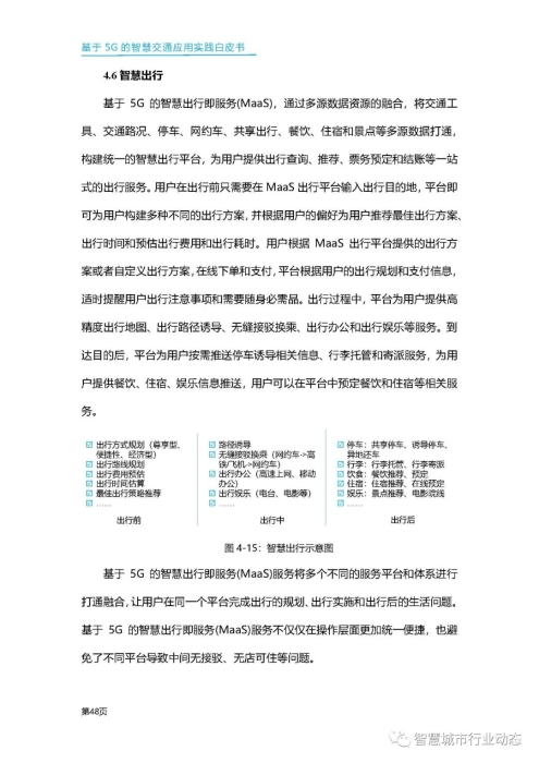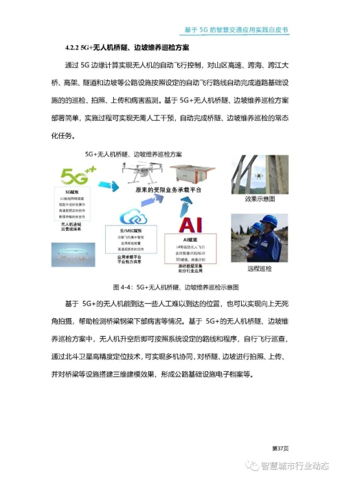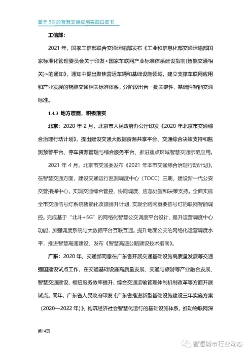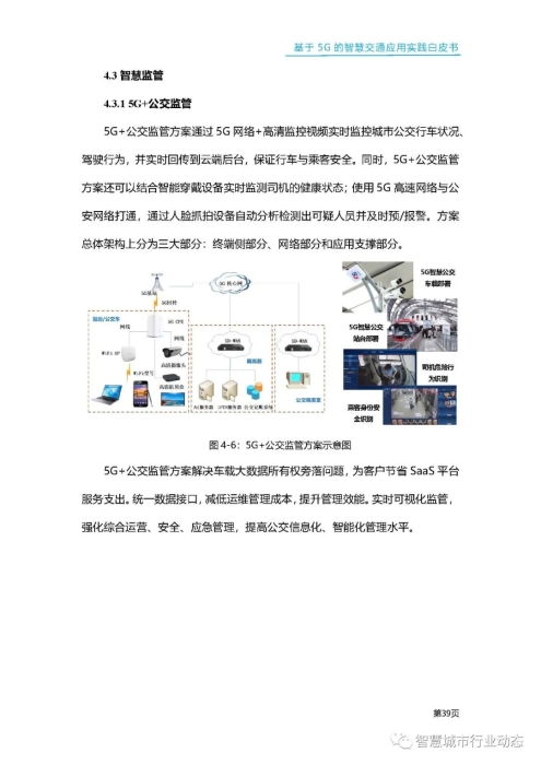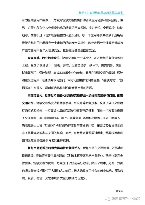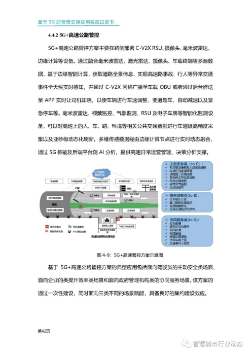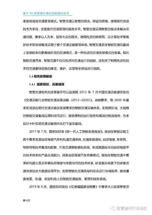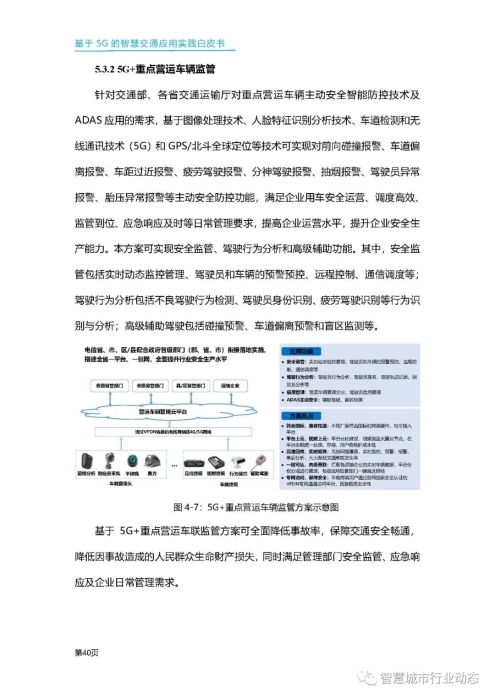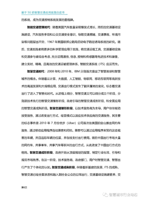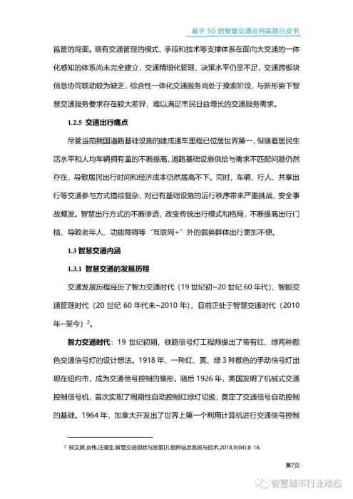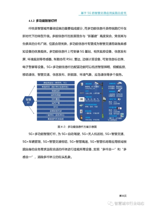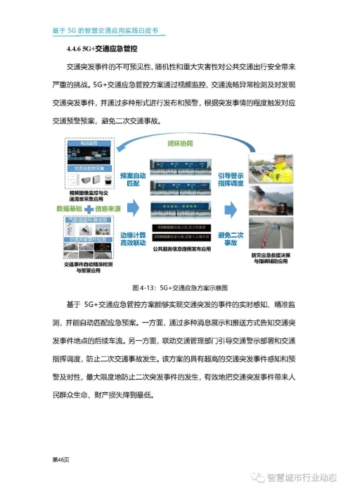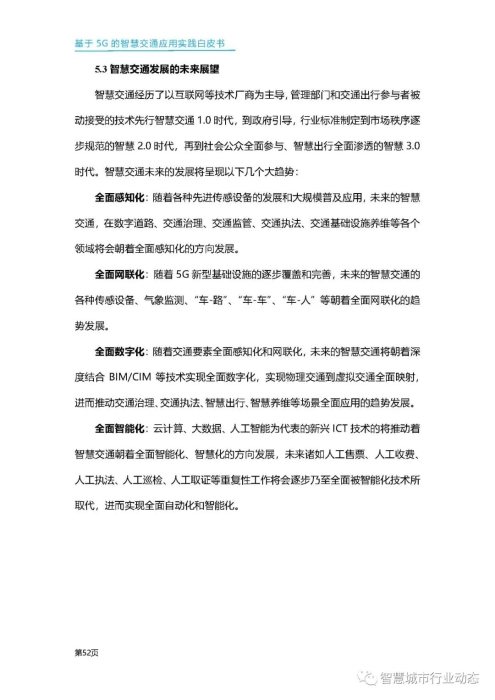 本白皮书围绕典型智慧交通典型应用场景, 充分结合 5G 、边缘计算、无人机、人工智能、物联网等一批先进 I CT 技术的特点, 从实践出发抛砖引玉,探索智慧交通 领域 中 面向道路基础设施的数字道路解决方案( 5G+ 车联网方案和多功能智慧灯杆解决方案),面向交通状况及交通基础设施的智慧巡检方案(基于5G+ 无人机的重点交通状态巡检方案、基于 5G+ 无人机的桥梁、边坡及隧道维养巡检方案和基于 5G+ 无人机的交通工程巡检方案), 面向营运车辆的交通监管方案( 5G+ 公交监管、 5G+ 重点 营运车辆监管 、面向 运营主体 的智慧管控方案5G+ 重点交通枢纽管控方案、 5G+ 高速公路管控方案、 5 G+ 机场管控方案、5G+ 轨道交通管控方案、 5G+ 港口管控方案、 5G+ 交通应急管控方案)、面向交警和交管执法的智慧执法方案以及面向社会公众的智慧出行方案。
