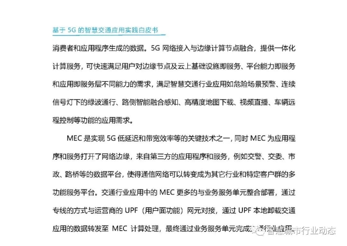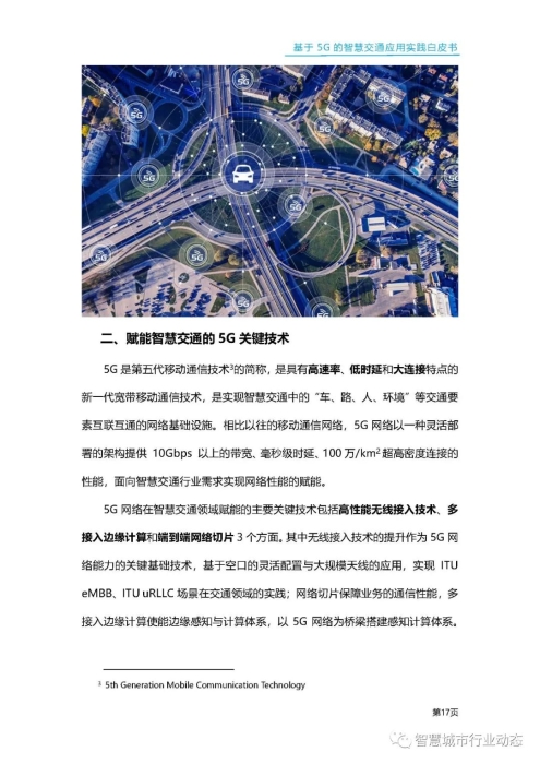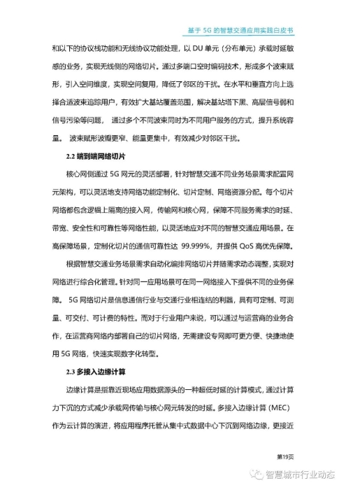 5G网络在 智慧 交通领域赋能的主要关键技术包括 高性能无线接入技术 、 多接入边缘计算 和 端到端网络切片 3 个方面。其中无线接入技术的提升作为 5G 网络能力的关键基础技术,基于空口的灵活配置与大规模天线的应用,实现 ITUeMBB 、 ITU uRLLC 场景在交通领域的实践;网络切片保障业务的通信性能,多接入边缘计算使能边缘感知与计算体系,以 5G网络为桥梁搭建感知计算体系。