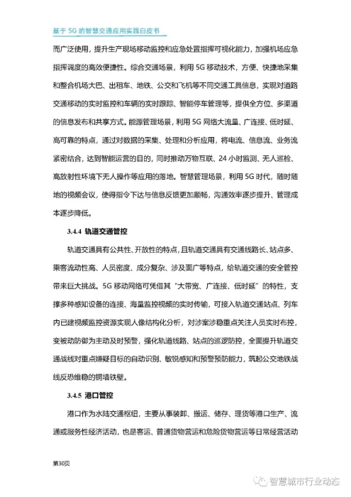 《交通运输政务信息资源目录编制指南(试行)》对交通业务领域进行了划分,主要包含民用铁路交通、水路交通、道路交通、道路运输、城市客运、交通管控、城市停车等 7 个业务领域。本白皮书结合当前行业发展热点方向及新技术融合思路,探索 5G 等新兴 I CT 技术 在 交通基础设施建设与改造场景(车联网场景、智慧灯杆等)、 面向交警的 交通巡检场景(重点区域交通状况巡检、桥梁隧道与边坡的维养巡检、交通工程建设巡检)、 面向交管部门的 监管场景(公交监管场景、重点营运车辆监管)、 面向运营主体和公安的 管控场景应用 (交通枢纽管控、高速公路管控、机场 管控、轨道交通管控、港口管控和临时应急管控)、面向交警与交通的交通执法场景以及面向社会公众的出行场景的应用情景 。