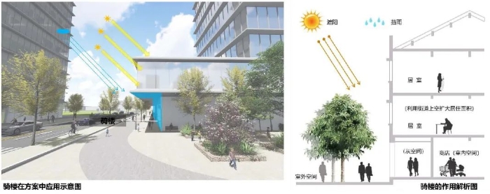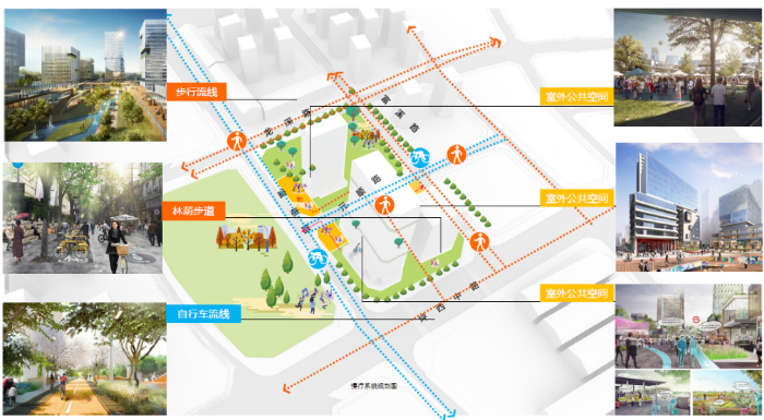 项目构建联系区域公园绿地、公共开放空间的连续性步行系统,营造良好的步行体验。更新后设置独立自行车道与自行车停车区,与区域的自行车道系统衔接,鼓励自行车、共享单车出行。沿慢行系统规划设计风雨廊道、骑楼,形成涵盖自行车、步行的人性化慢行空间。