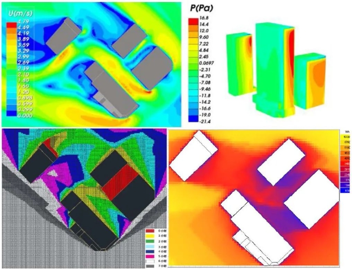 更新设计中不断调整优化建筑布局,采用计算流体力学计算软件对场地自然通风进行模拟,模拟夏季室外场地1.5m处风速,保证室外活动场地的自然通风。采用日照模拟软件对大寒日8:00-16:00的建筑日照进行分析,指导建筑内部功能分布。在满足日照的基础上,保证研发办公、配套宿舍取得最佳日照面。项目周边辐射量较大,通过建筑群的相对围合营造,更新后活动场地的辐射量大幅度下降,营造良好的热舒适环境。