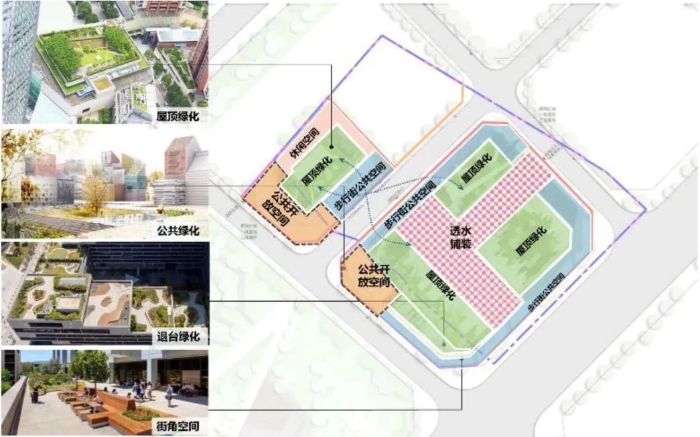 绿色植物是进行碳汇的主要载体,通过规划多层次的绿化空间增加区域内的碳汇效应。通过城市更新给建筑以及公共空间场地赋予多层次的绿色植物,并布置各类海绵设施,是维持更新后可持续低碳的重要方式。