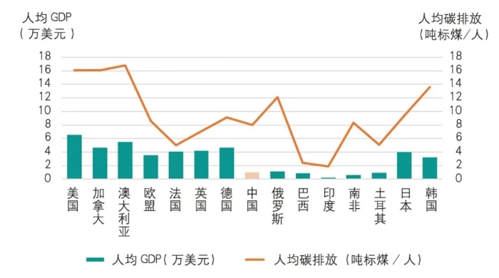 ▲ 图2 2019年世界主要国家及欧盟地区人均GDP与人均碳排放量的关系