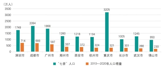 从2020年第七次全国人口普查的结果看,近10年我国人口流动呈现出新的趋势。一方面,我国生态脆弱地区人口减少,生态环境压力得到进一步缓解。近10年来,生态脆弱地区的总人口不断减少,从2010年的2.9亿人减少到2.8亿人,减少了1000万人,人口的减少一定程度上缓解了生态空间的环境压力。同时,近20年我国退耕还林还草约0.34亿hm2(约5.15亿亩),成林面积占全球同期增绿面积4%以上[4],实现了农业生产空间向生态空间的大规模“反哺”。另一方面,人口大量流入地区生态环境压力加大,人口增长最快的城市面临着安全挑战。2020年,京津冀、长三角、粤港澳、成渝城市群常住人口5.53亿人,比2010年增长5418万人,占全国比重达到40%(图3)。2020年,深圳、成都、广州、郑州、西安、杭州、重庆、长沙、武汉、佛山等10个人口增速最快的城市,人口总量达到1.58亿人,比2010年增长4210万人,其占全国人口的比重,由2010年的8.7%提高到2020年的11.2%(图4)。这些城市在人口快速集聚的同时,由于人口规模大、密度高,在极端事件下也往往成为灾害风险大、损失严重的地区,深刻地影响着人民群众的生产生活安全,如2020年武汉发生新冠疫情,2021年郑州“7·20”特大暴雨导致严重城市内涝。