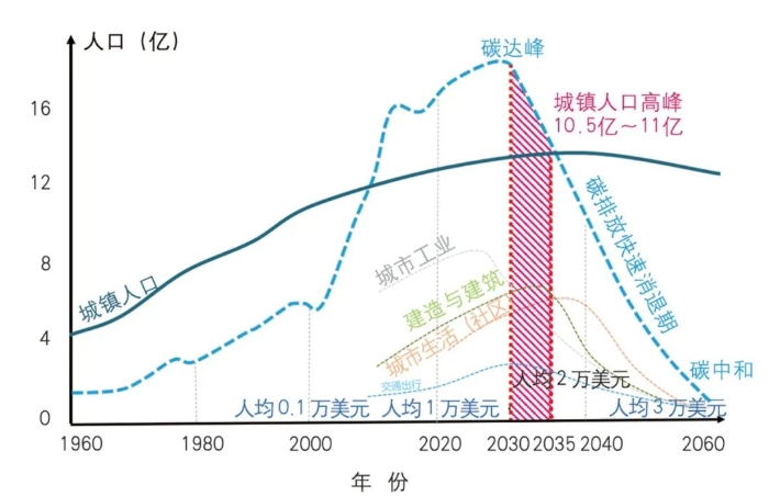 ▲ 图5 我国“双碳”目标、人均GDP增长与城镇人口高峰的时间路线图